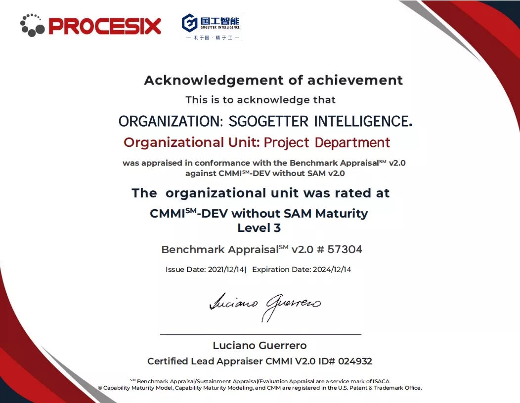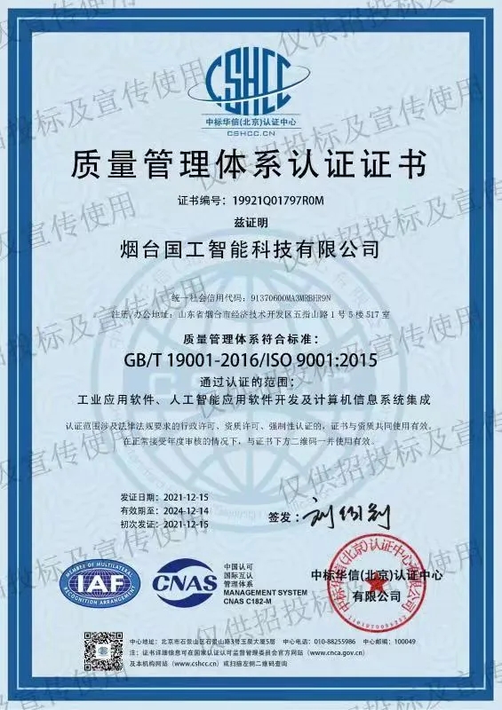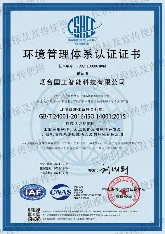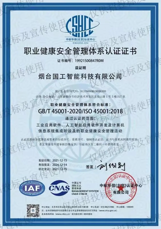 202112月中旬,煙臺國工智能科技有限公司正式獲得ISO 14001環境管理體系認證證書、ISO 9001質量管理體系認證證書以及ISO 45001職業健康安全管理體系認證證書。同期獲得了軟件能力成熟度模型集成(CMMI:Capability Maturity Model Integration)三級認證證書。標志著國工智能在智能制造行業的規范化和標準化管理達到新的水平。